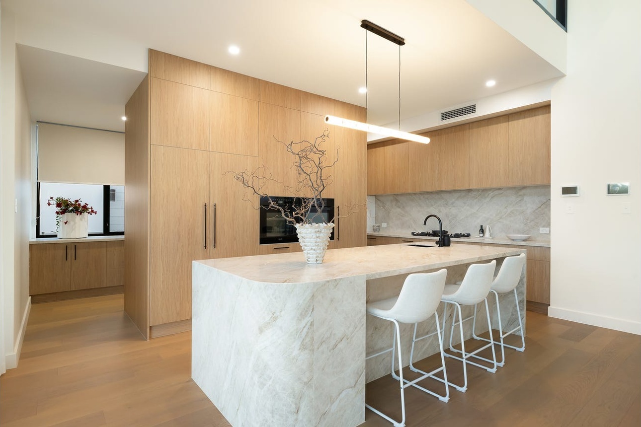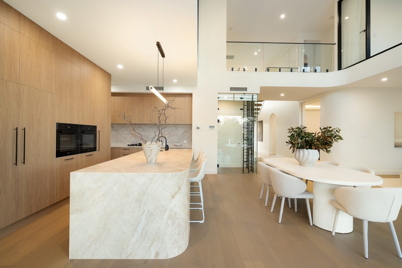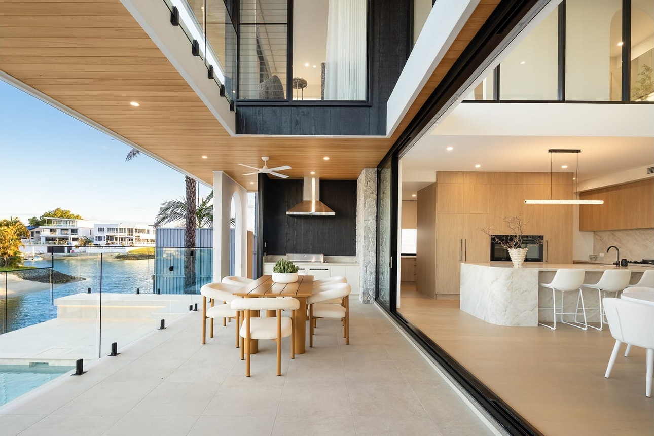 Warm timber soffits and raw stone thresholds ground a contemporary family home designed around openness, texture and effortless poolside entertaining.