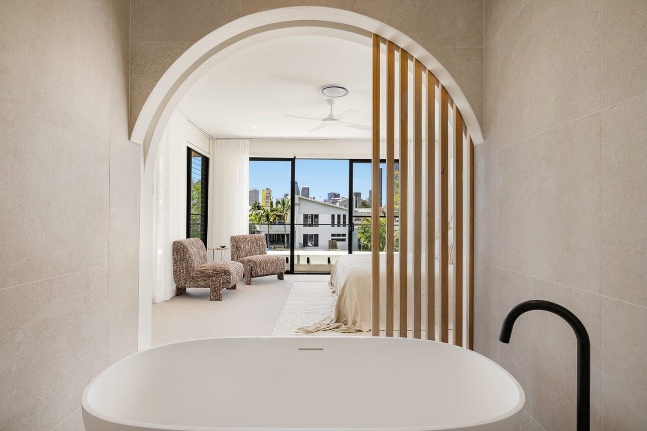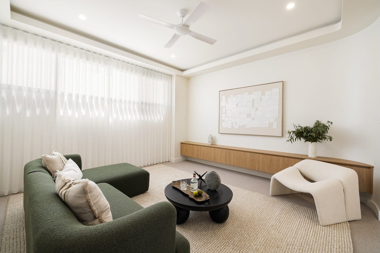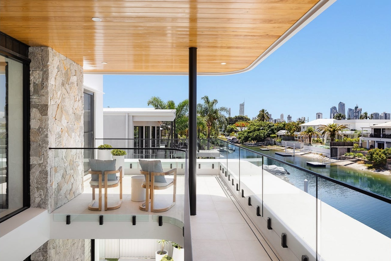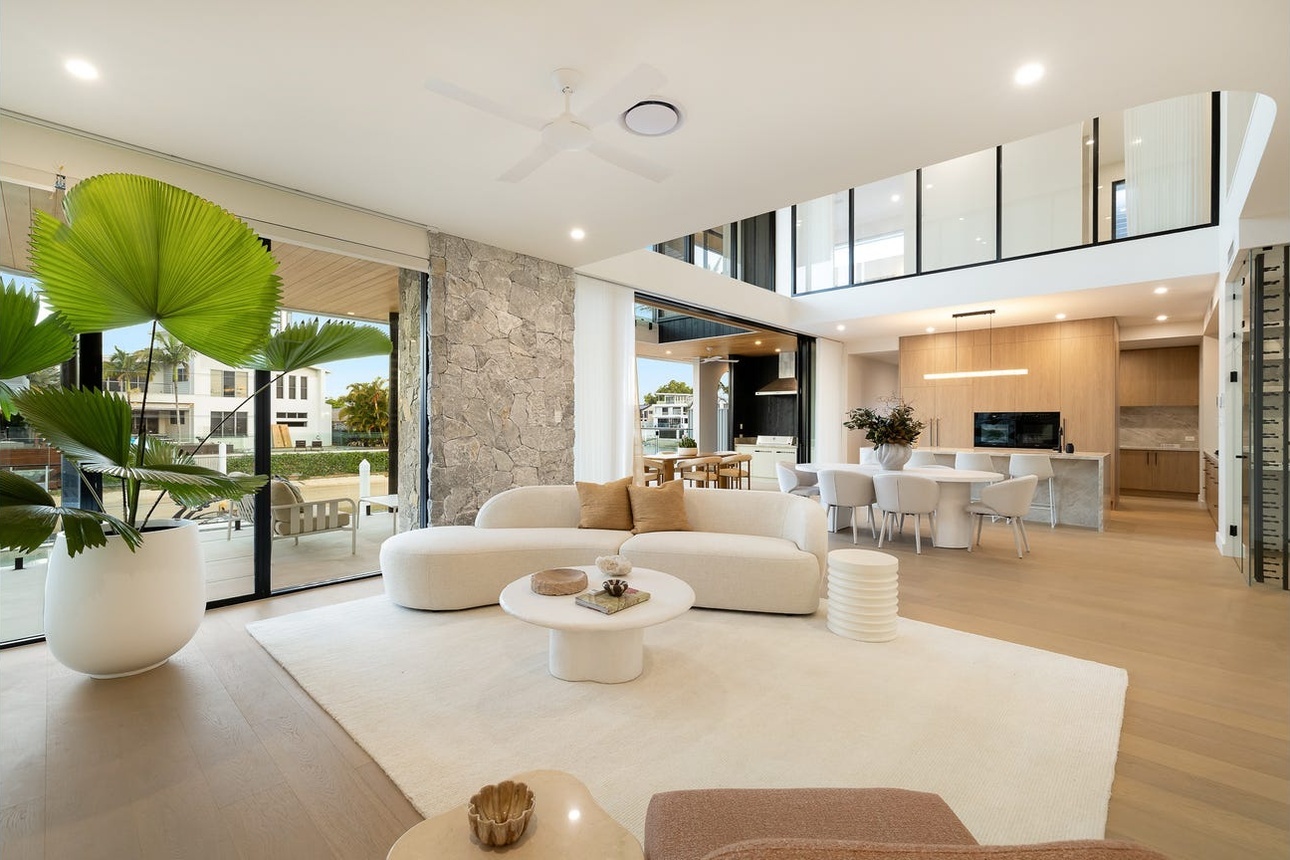 A refined two-storey residence where natural stone, timber screening and generous glazing converge to create seamless indoor-outdoor living framed by tropical landscaping.