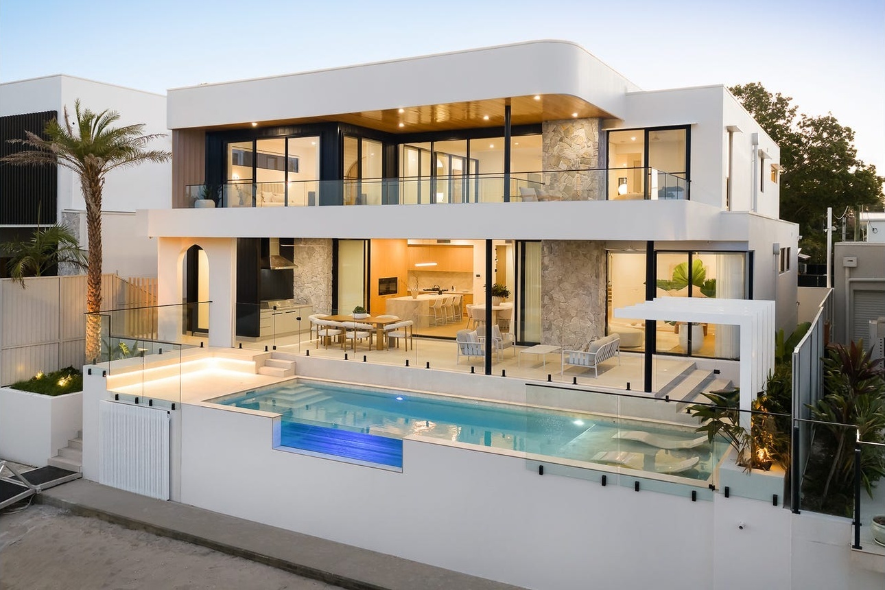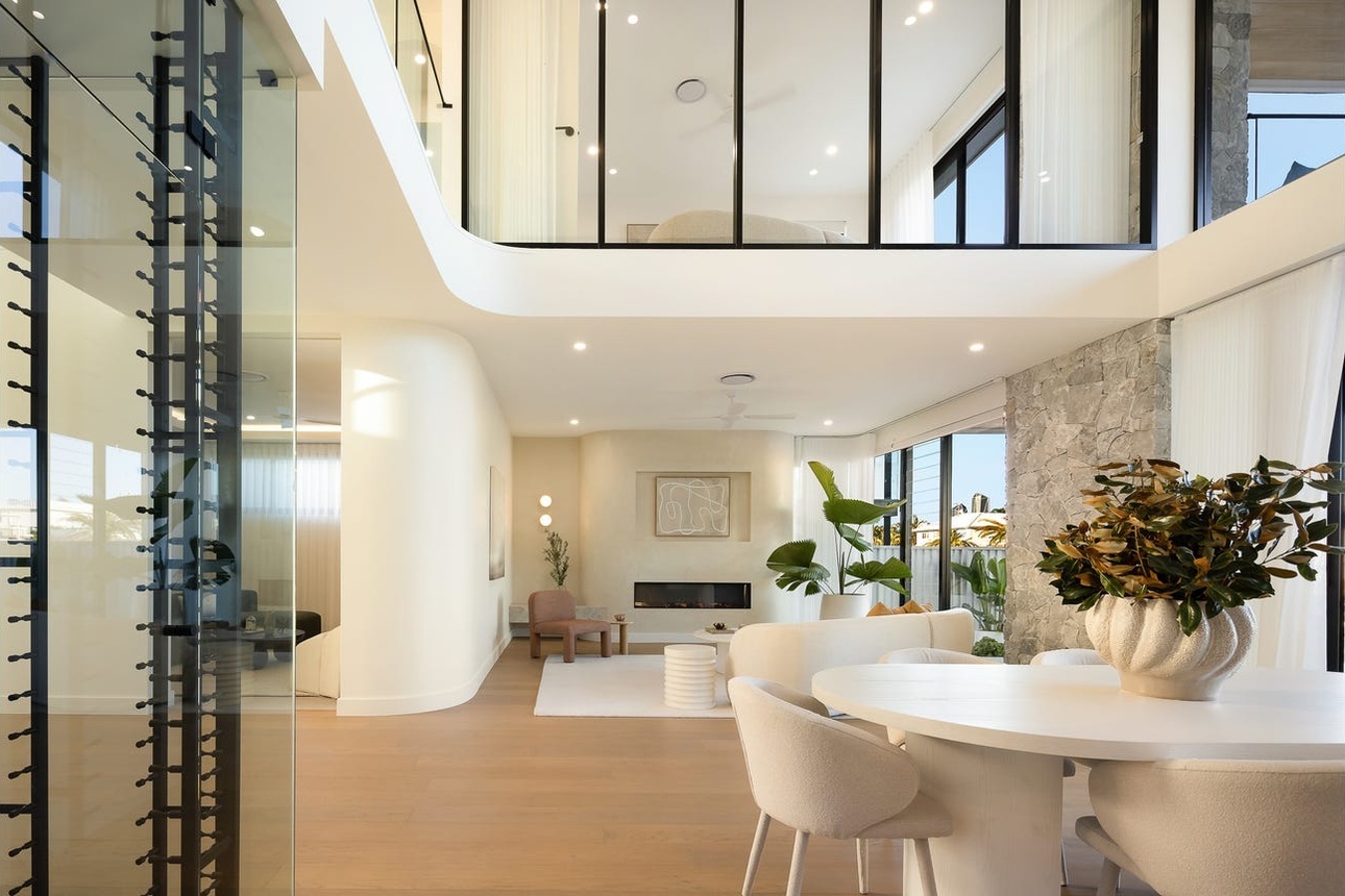 Full-height glass dissolves the boundary between open-plan living and an elevated pool terrace, inviting light and landscape into every space.