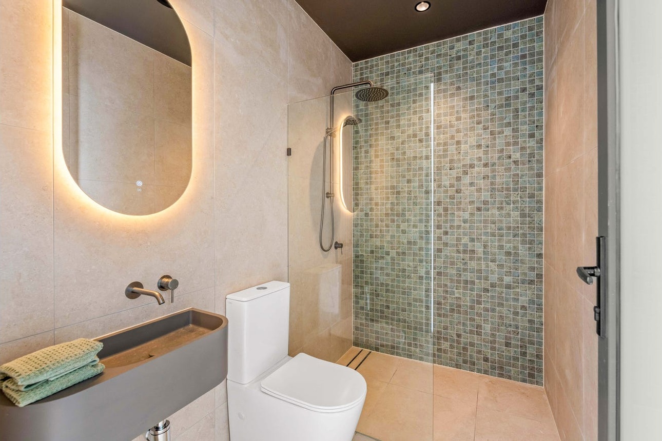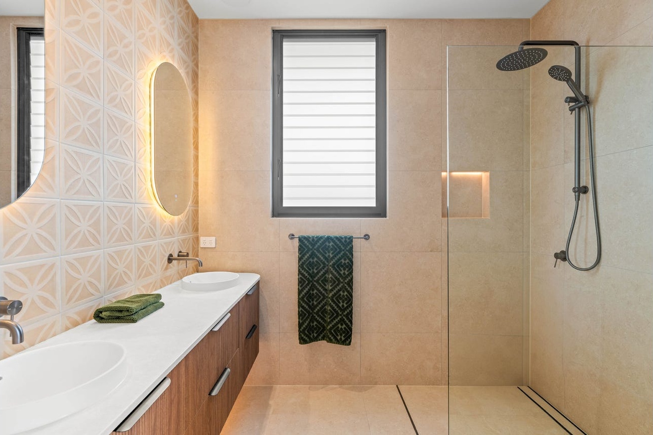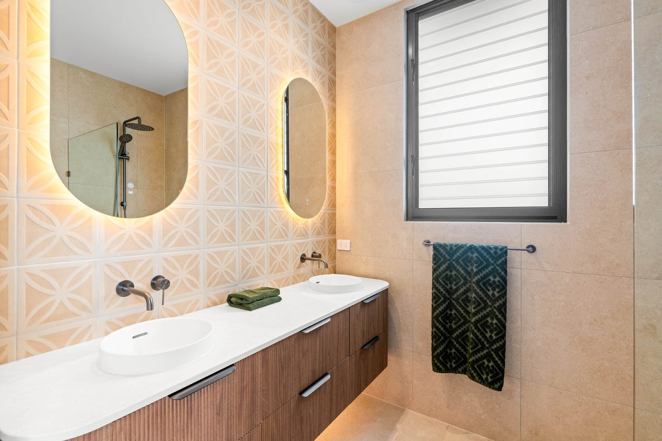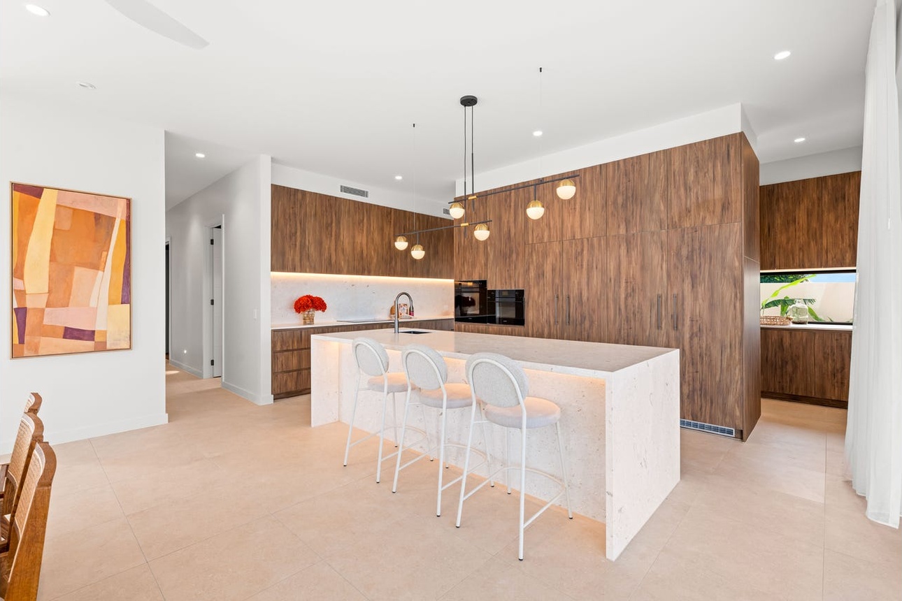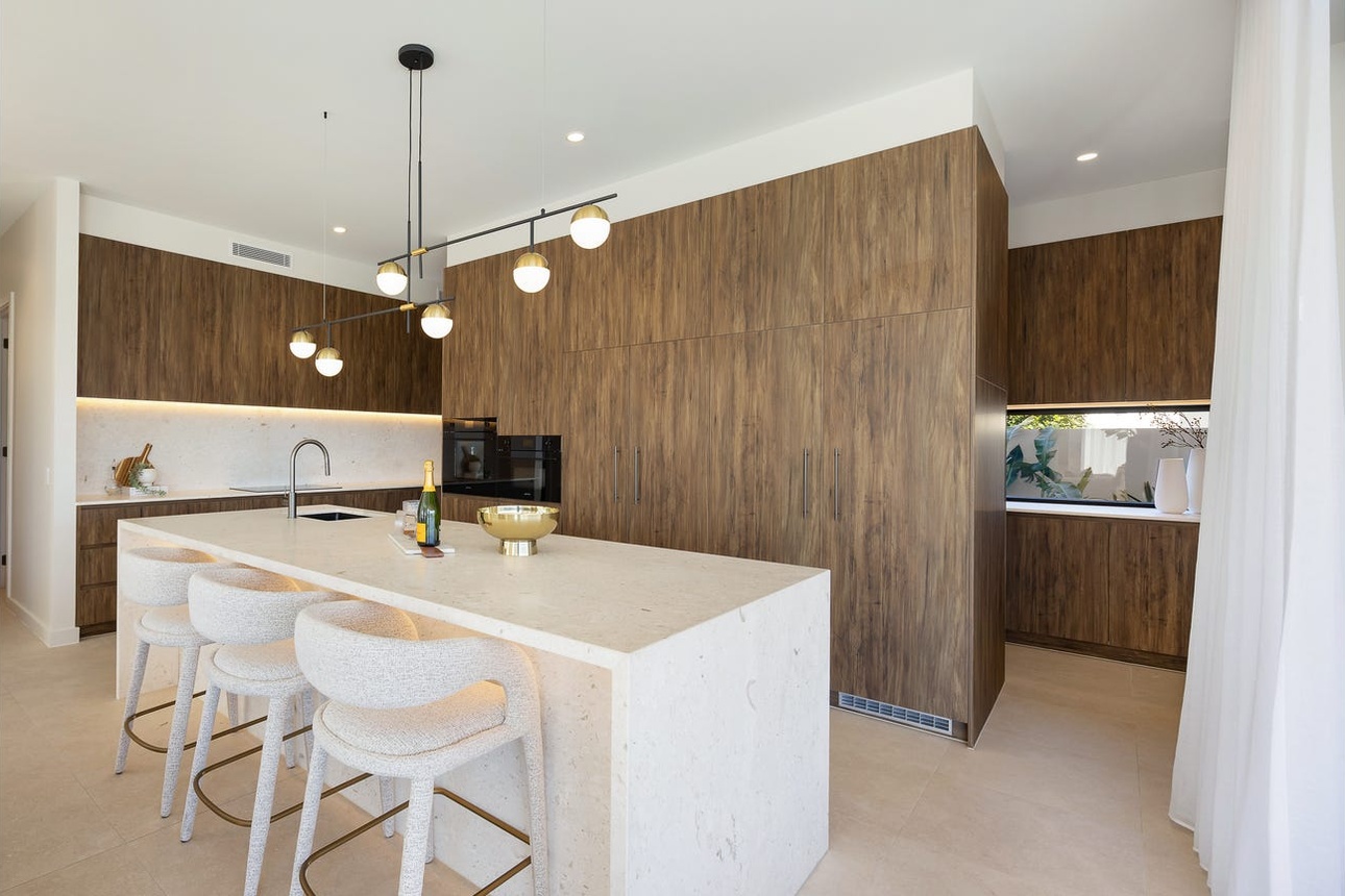 Inside, a sculptural stone island and rich timber cabinetry anchor the kitchen, with pendant lighting and a garden window splashback adding layers of light and craft.