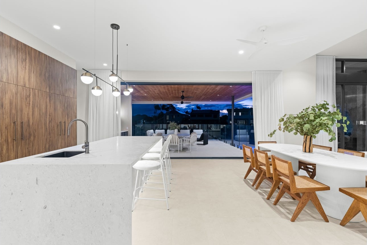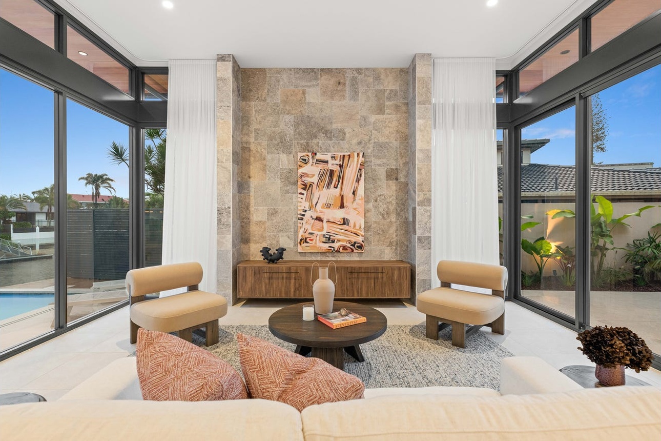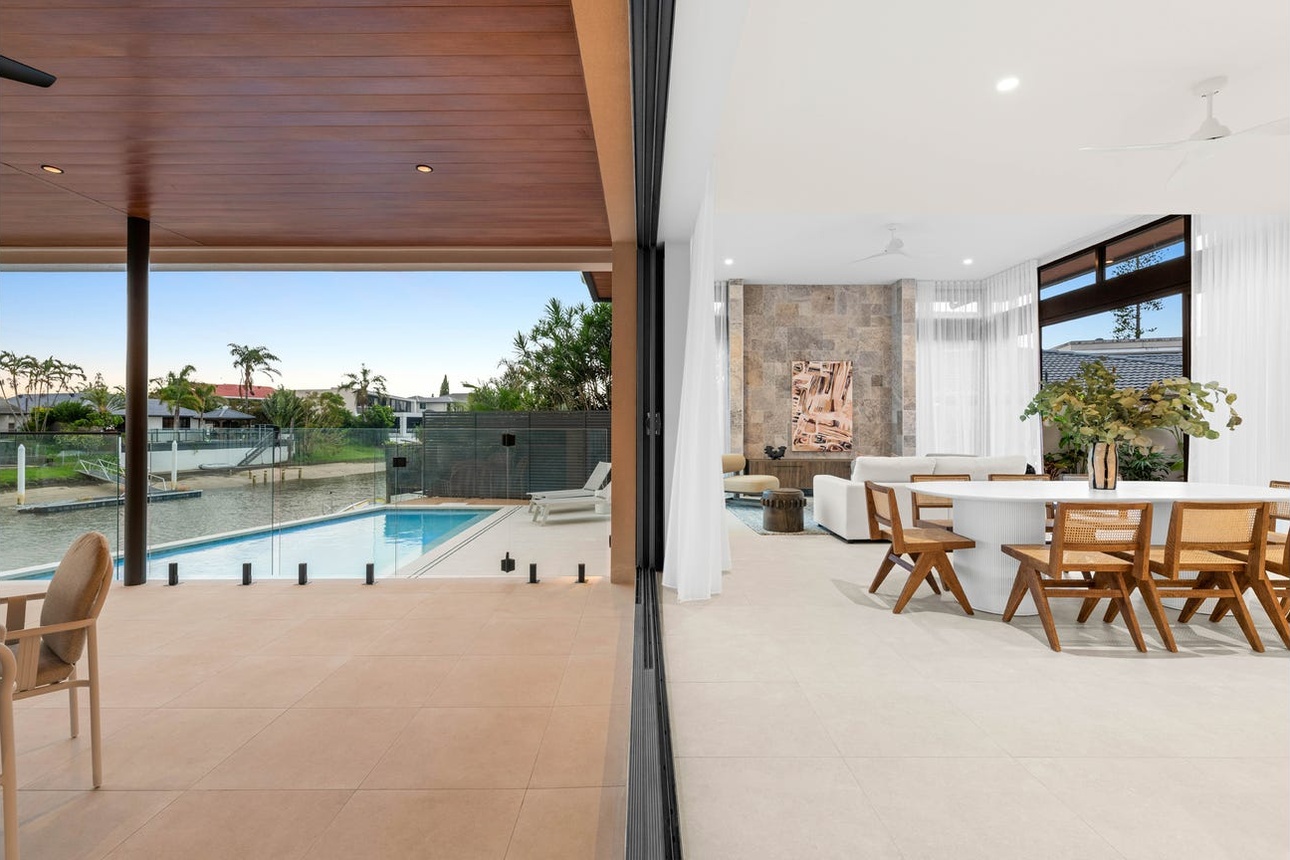 A waterfront home of generous proportion where timber-lined alfresco spaces, full-height glazing and a sunlit pool terrace frame an effortless canal-side life.