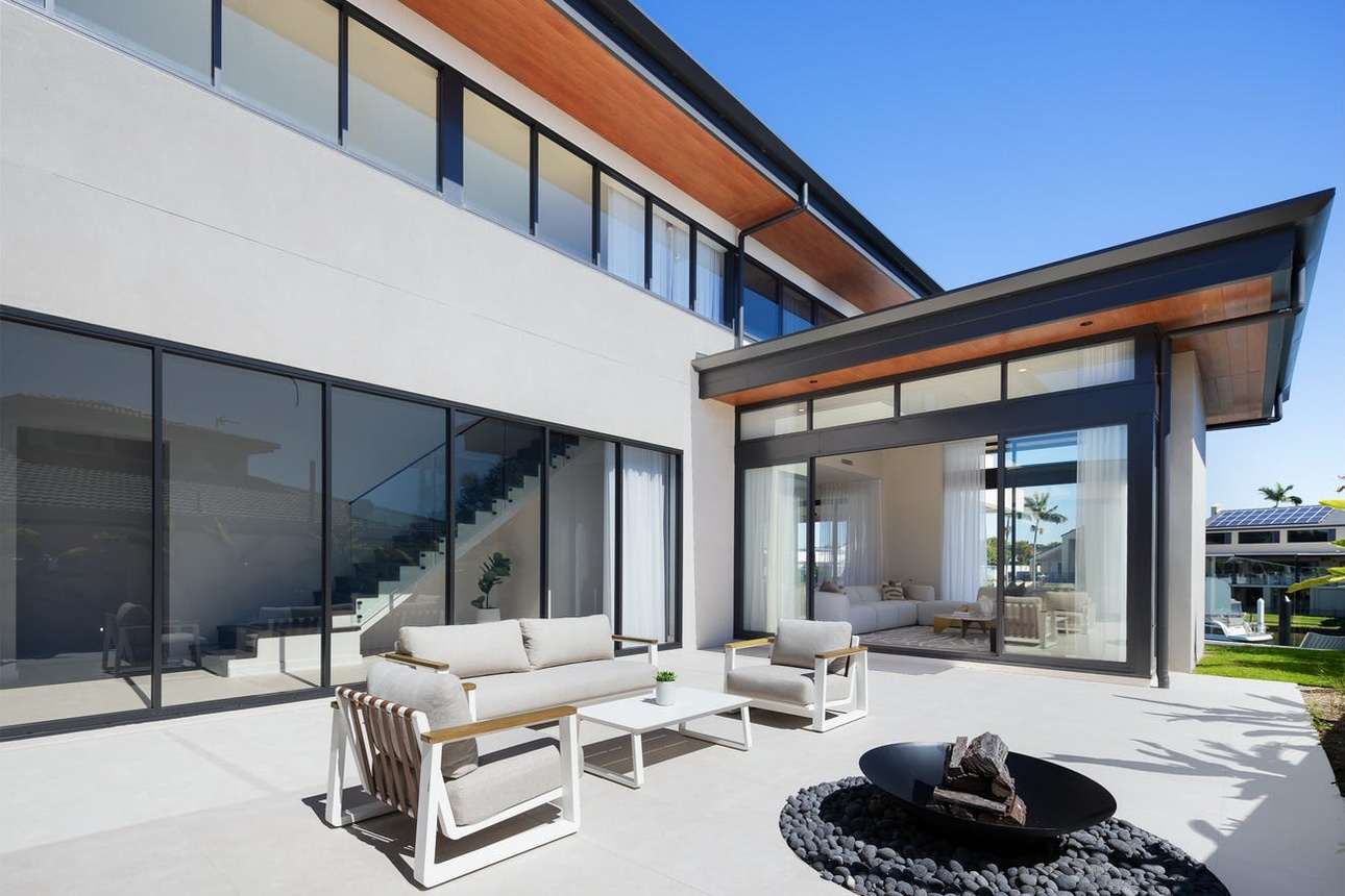 Dark steel framing and expansive glass open every living space to the water, while a warm timber soffit draws the interior atmosphere outward to the alfresco edge.